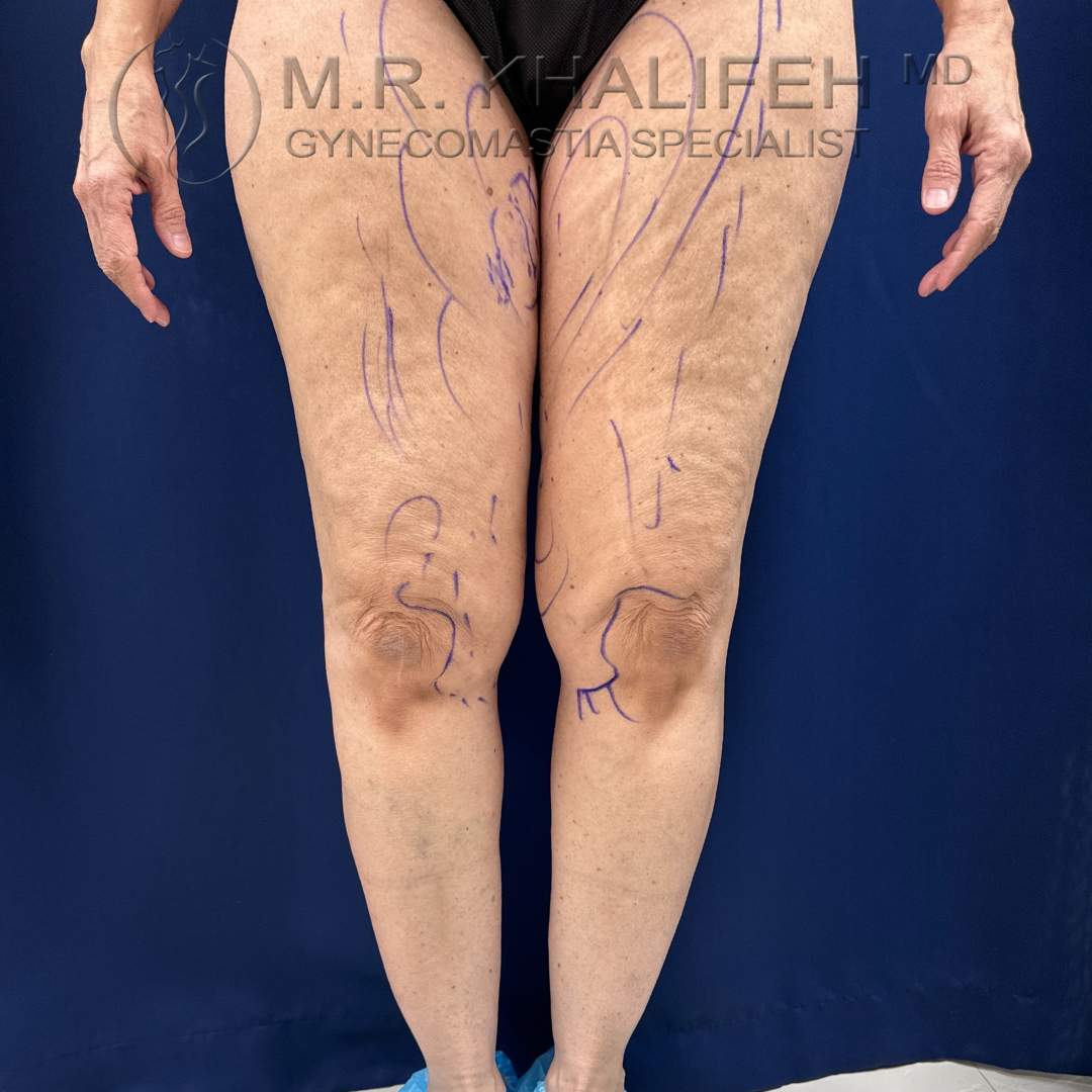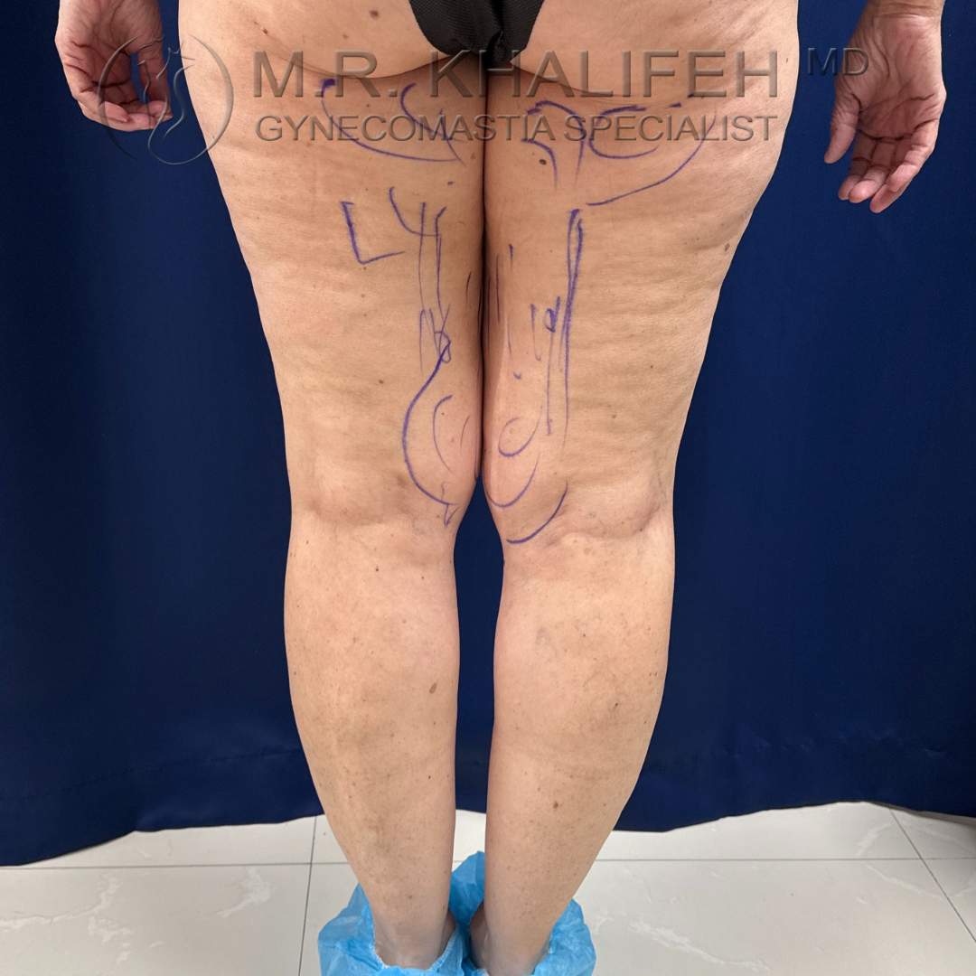 This patient had painful lipedema. In a staged fashion, awake, we first liposuctioned the inner part, then did the outer part. A good reduction in lipedema symptoms was achieved.