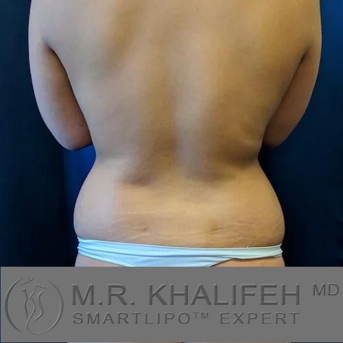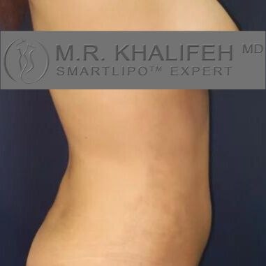 medium built woman with unfavorable fat deposits sought treatment by M.R. Khalifeh. We performed awake liposuction of abdomen, lower back flanks, and small volume 400 cc fat graft to buttocks