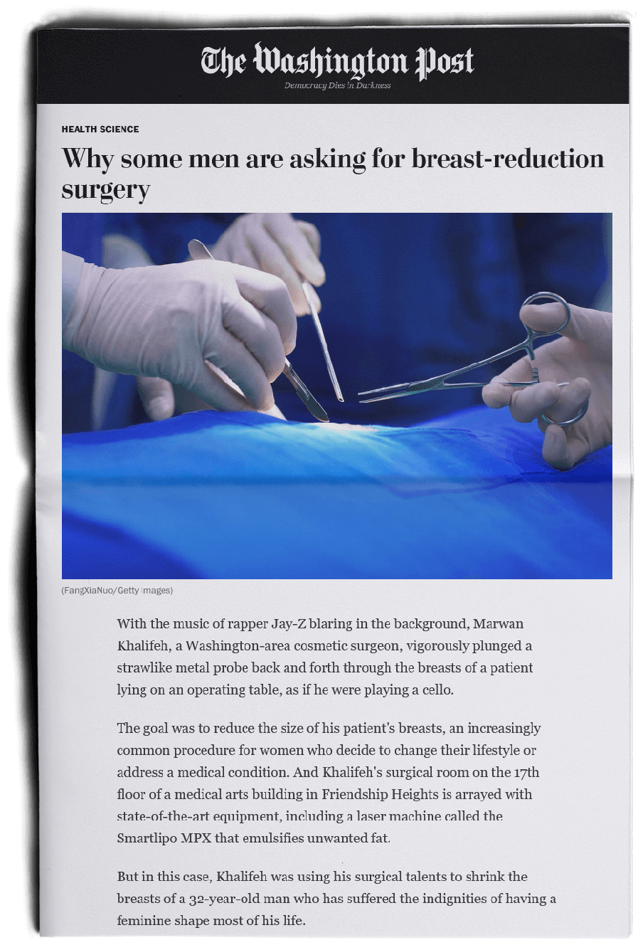 When the nation’s top reporters researched gynecomastia for the Washington Post, their research naturally led them to Dr. Khalifeh, one of the nation’s leading experts on the matter. We invited them into our suite to first hand report on a live surgery. Read here the article about Gynecomastia and Dr. Khalifeh.